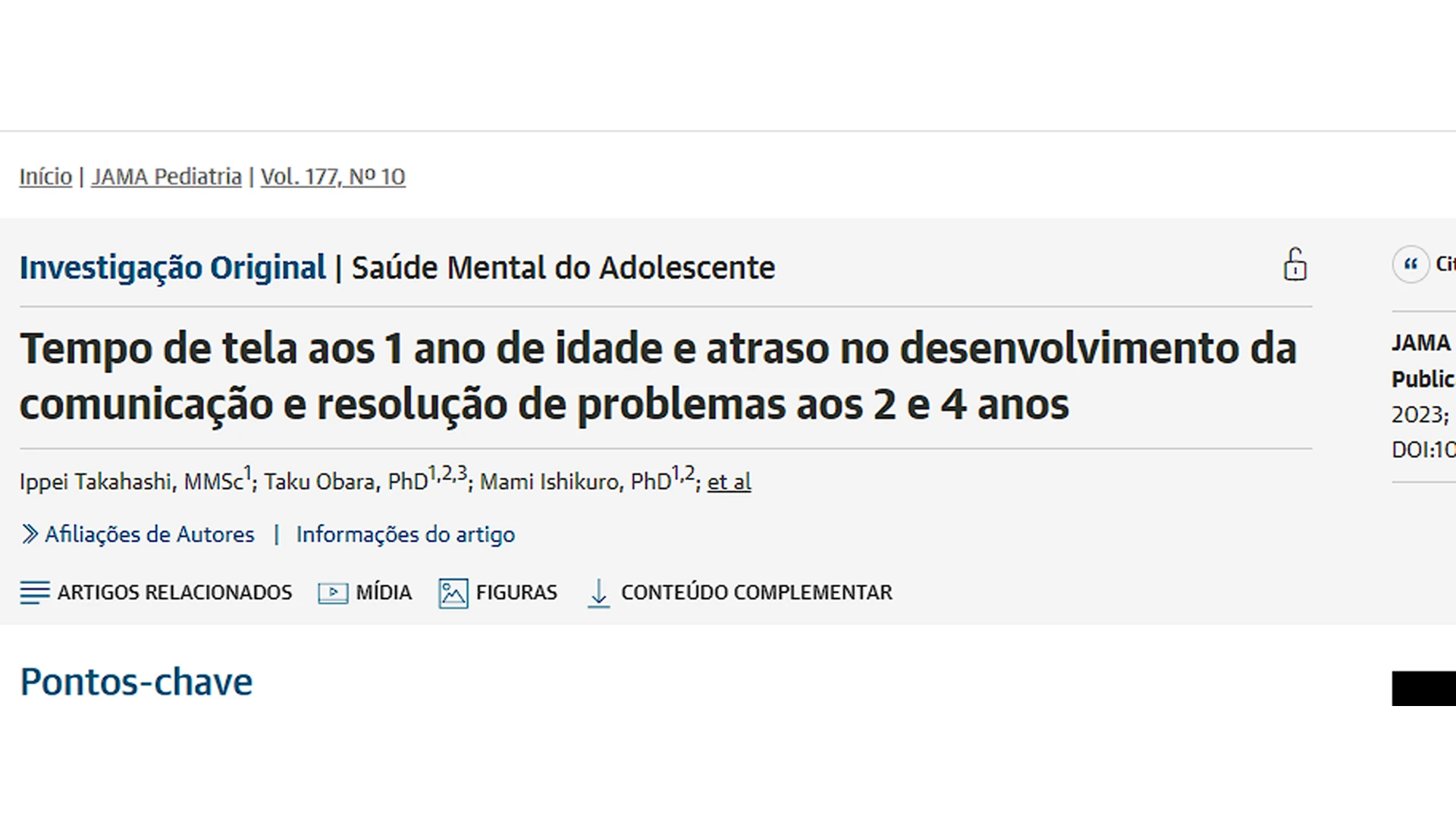 Artigo Cientifico: Tempo de tela aos 1 ano de idade e atraso no desenvolvimento da comunicação e resolução de problemas aos 2 e 4 anos – Ippei Takahashi, MMSc1; Taku Obara, PhD1,2,3; Mami Ishikuro, PhD1,2
